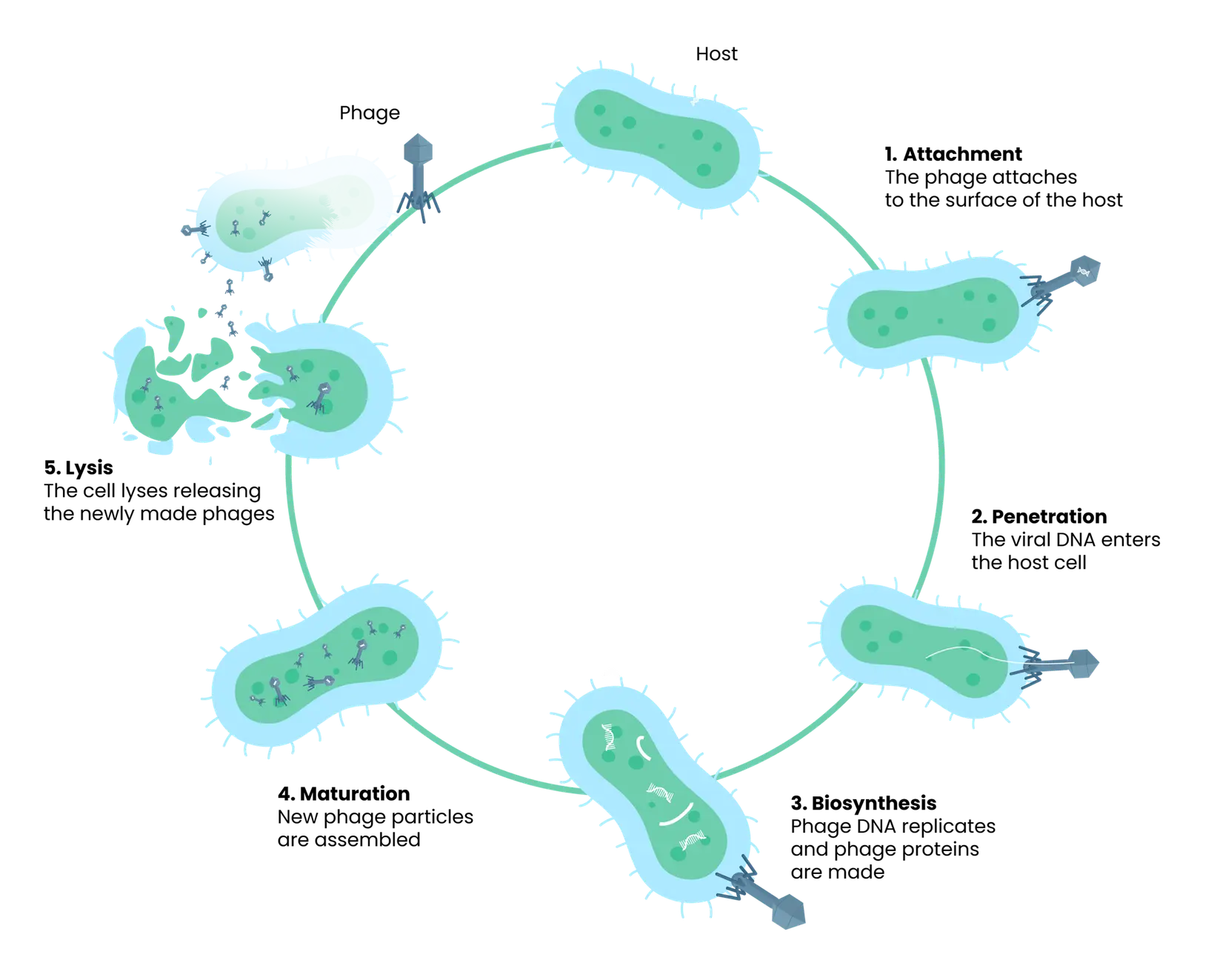 The infographic below illustrates the key stages of the bacteriophage lifecycle.